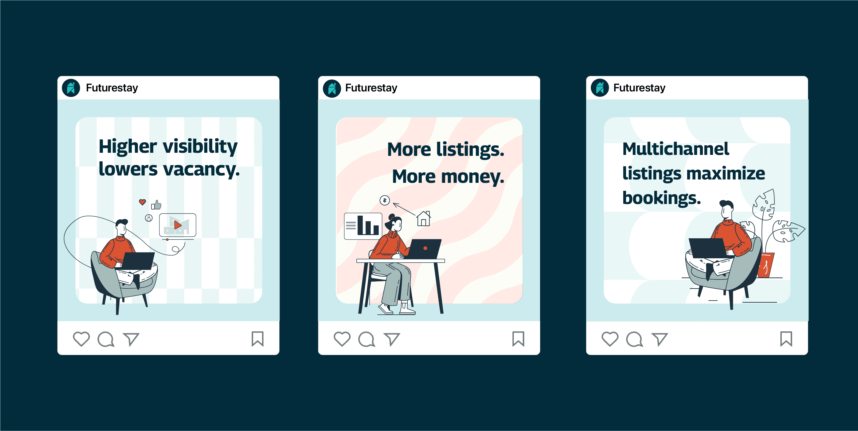 We led a visual rebrand for Futurestay as part of a broader effort to position the platform for the emerging DIY “rental-preneur.” The work included a redesigned logo and visual identity, establishing direction across marketing and product touch-points. To reflect the hands-on nature of this audience—often scaling from a single rental property to multiple listings—We created an origami-inspired house symbol that captures both the DIY spirit of the brand and its roots in real estate. The mark also subtly echoes a bookmark shape, reinforcing Futurestay as a web-based SaaS platform. A fresh aqua mint paired with burnt orange accents balances themes of modern finance with the bold ambition of the rental-preneur audience, while clean typography and generous white space reinforce the platform’s simplicity and ease of use. Brand personality pillars for this project included Clear. Confident. Empowerment.